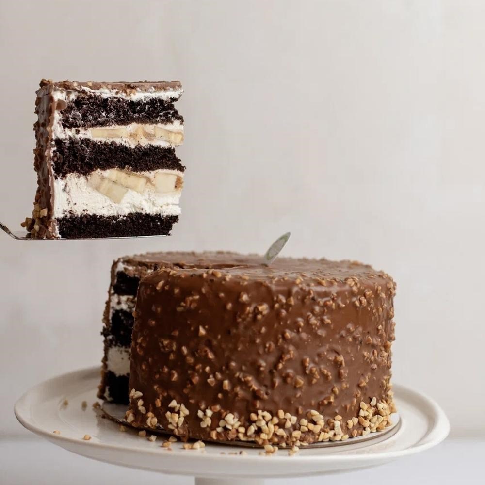 Шоколадный бисквит, крем чиз, карамель собственного производства, банановая прослойка и сверху молочный бельгийский шоколод с дробленым фундуком