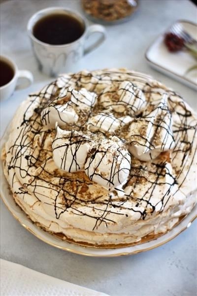 Меренговые коржи, песочное тесто, крем из вареной сгущенки и сливочного масла. Оформлен грецким орехом и темным шоколадом