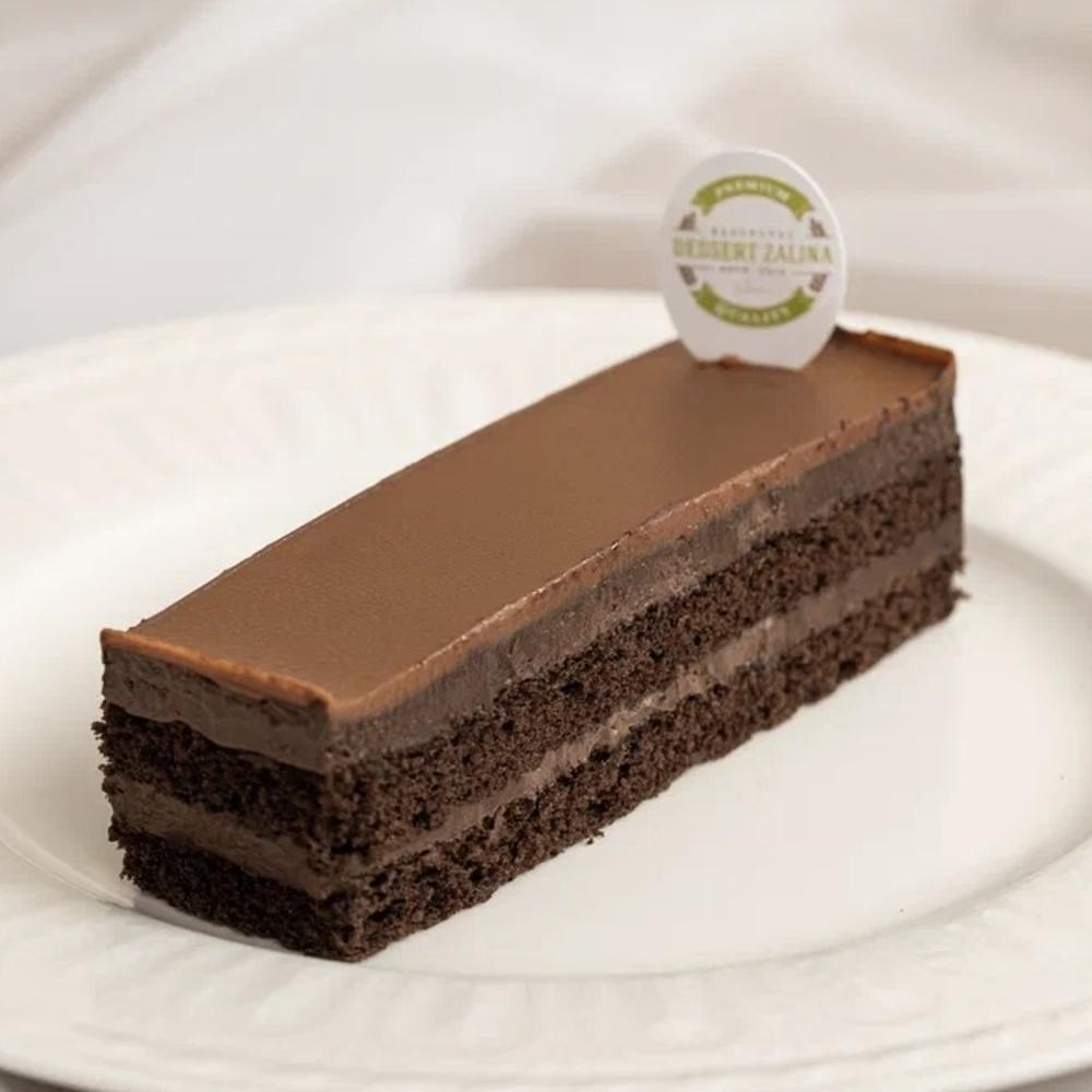 Шоколадный бисквит и шоколадный крем, сверху ганаш из молочного шоколада